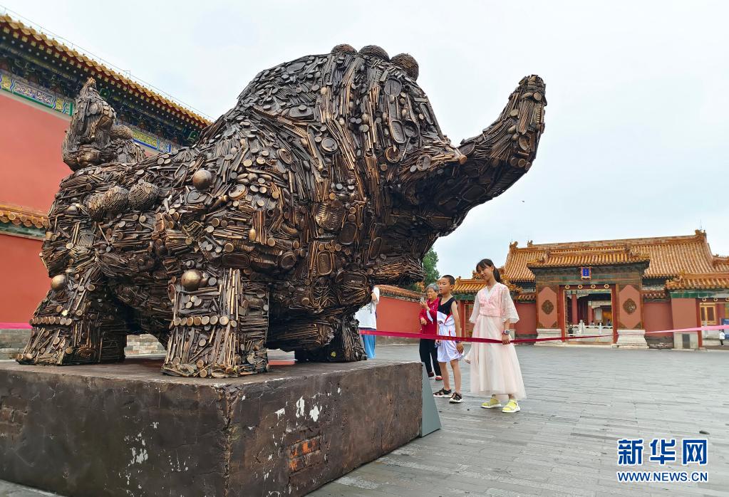 这是故宫内展出的《福牛辞“旧”》废弃物再生雕塑(7月13日摄)。