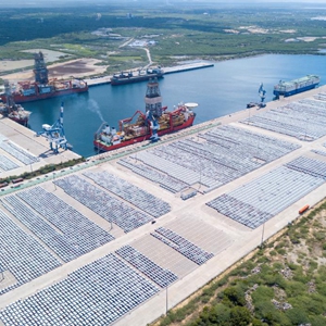 这是5月6日无人机拍摄的斯里兰卡汉班托塔港堆场上停满的滚装车辆。