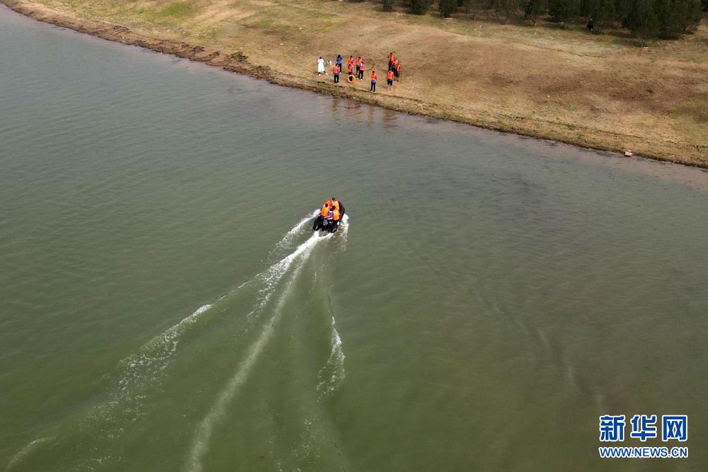7月14日,河北省邢台市城管局工作人员驾驶冲锋舟进行搜救“落水人员”演练(无人机照片)。