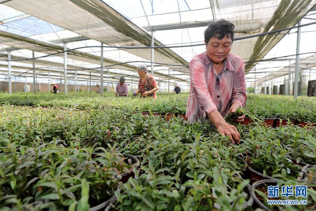 7月14日,全椒县六镇镇东王村村民在温室大棚里为铁皮石斛除草。