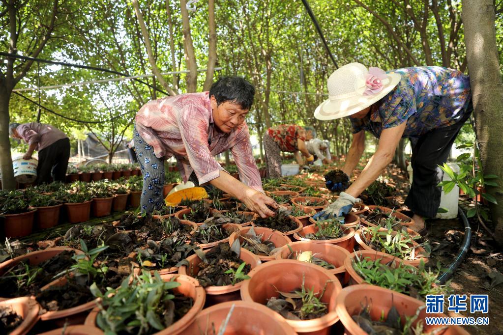 7月14日,全椒县六镇镇东王村村民为林下种植的铁皮石斛添加基质和有机肥。