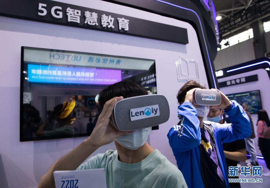 5月27日,在2021中国国际大数据产业博览会展馆,观众在体验5G智慧教育项目。