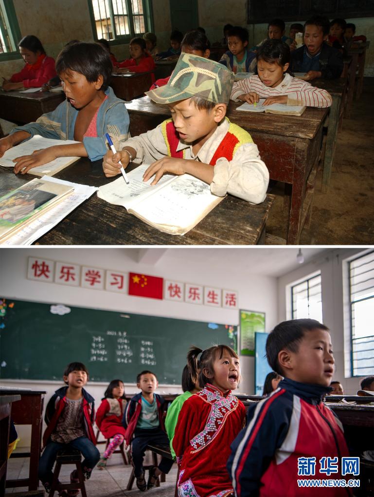 这是一张拼版照片。上图:2003年6月13日,云南省澜沧拉祜族自治县木戛乡哈卜吗村小学的学生张扎妥(右)在教室上课(新华社记者 秦晴摄);下图:2021年3月3日,张扎妥的女儿张娜妥(右二)在哈卜吗村小学一年级的课堂上(新华社记者江文耀摄)。