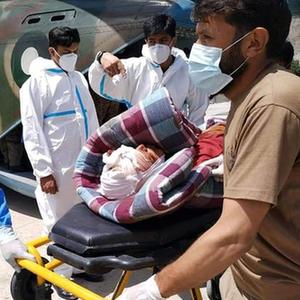 7月14日,在巴基斯坦吉尔吉特,人们将伤员运往医院。