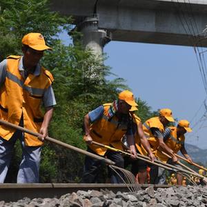 7月14日,工作人员在太焦铁路东坡到孔庄间线路上整修轨道。