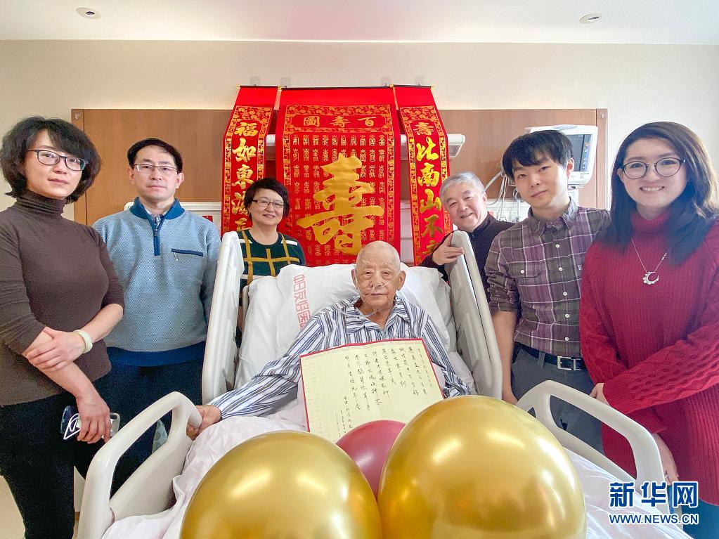 2021年2月12日,辛育龄在北京中日友好医院庆祝百岁生日,与家人合影。