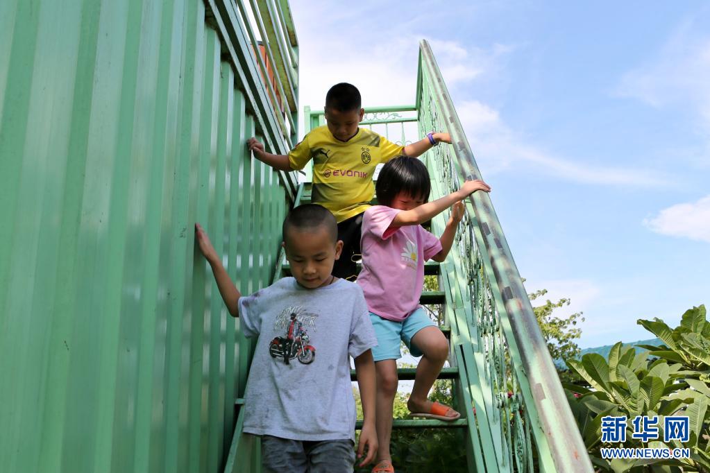 7月14日,在广东省中山市南朗镇左步村,小朋友在玻璃书屋外玩耍。新华社记者 耿馨宁 摄