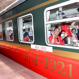 2021年6月25日,乘坐Y701次“上海至嘉兴红色旅游列车”的旅客在铁路上海西站准备出发。这是一趟红色教育主题列车,连接起上海中共一大会址与嘉兴南湖。