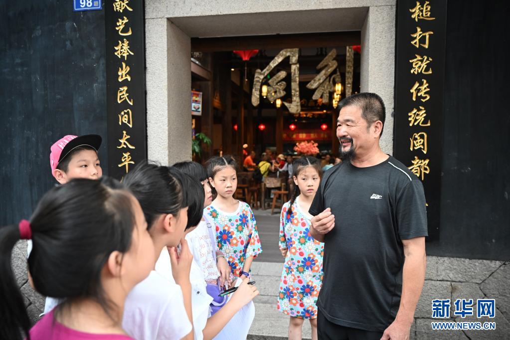 7月11日,在福州三坊七巷历史文化街区南后街,福州同利肉燕第四代传人陈君凡(右一)向小朋友介绍美食文化。