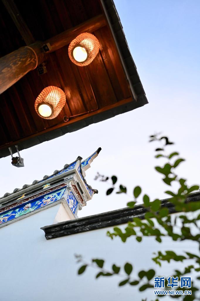 福州赤桥公园内,灯光映照一处修缮一新的古民居(7月13日摄)。
