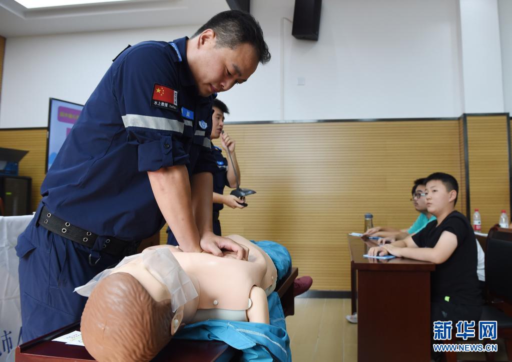 7月15日,在合肥市常青街道姚公社区,合肥市水上应急救援队队员用模型为孩子们介绍溺水后自救互救知识。