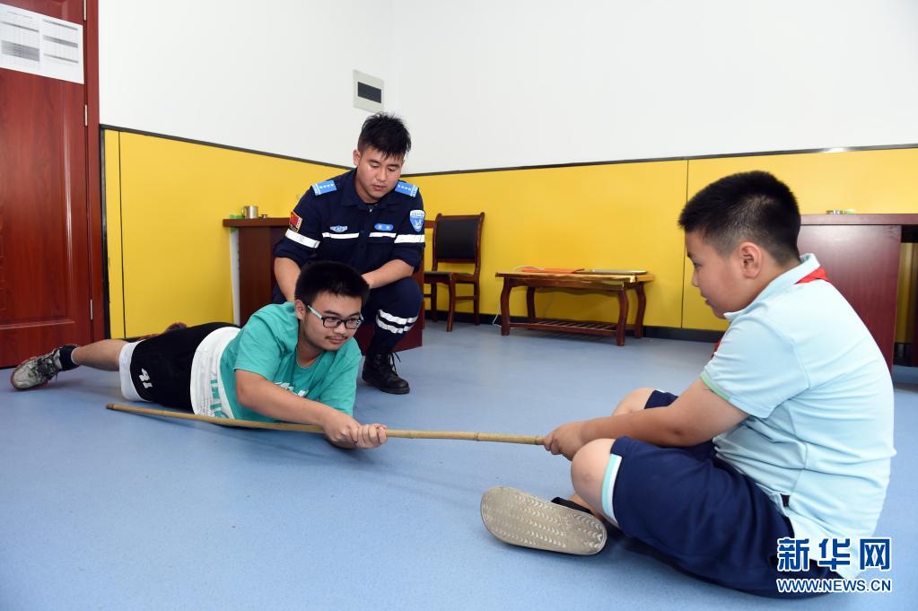 7月15日,在合肥市常青街道姚公社区,合肥市水上应急救援队的队员用现场演练的形式为孩子们介绍溺水后自救互救知识。