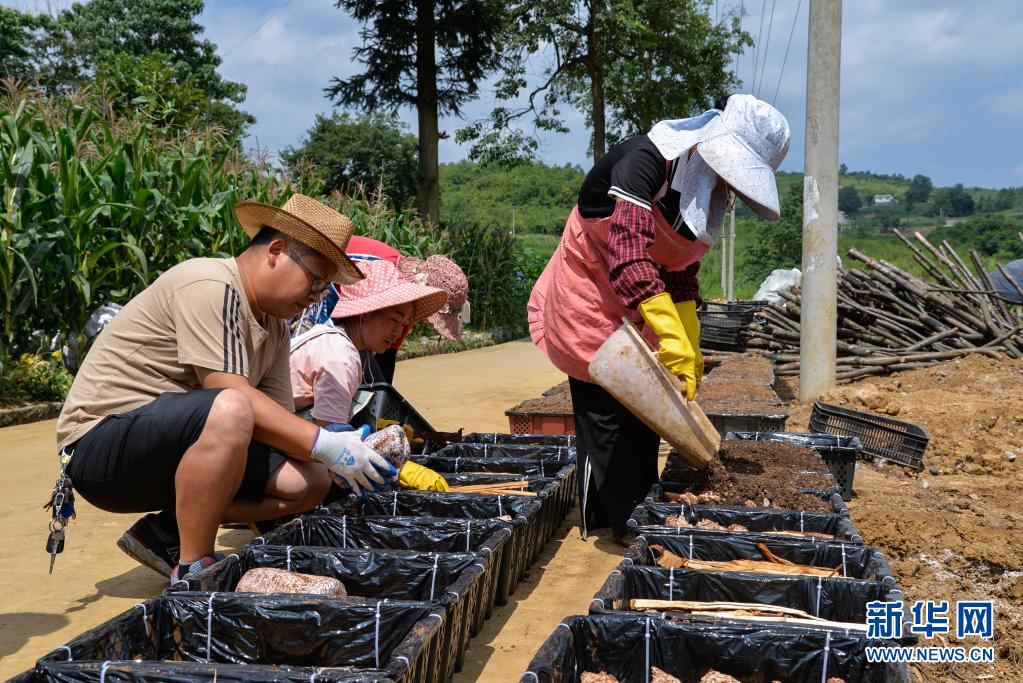 村民在贵州毕节黔西市绿化乡湾箐村一处种植大棚外装箱栽培红托竹荪(7月14日摄)。