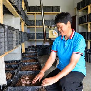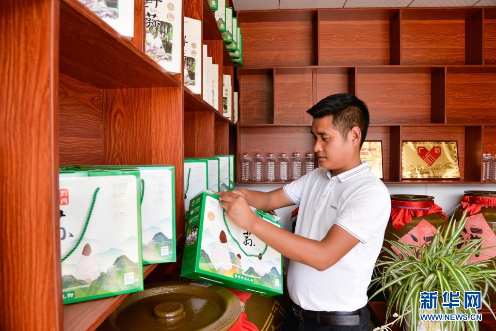 在贵州毕节黔西市绿化乡湾箐村,李金玉在整理红托竹荪礼盒包装(7月14日摄)。
