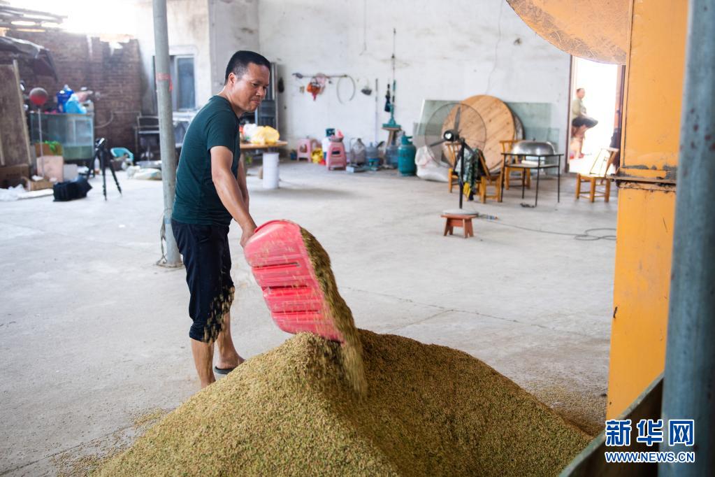 7月15日,湖南省湘乡市育塅乡南水村的村民李立平把刚收割的稻谷放入烘干机。