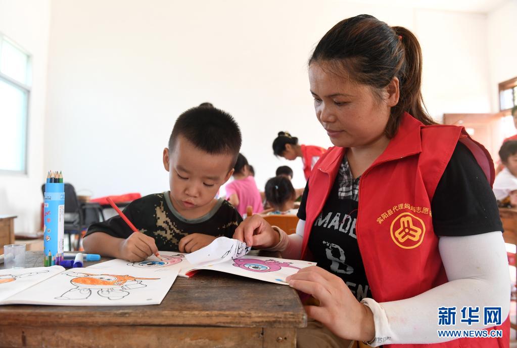 7月16日,在宾阳县中华镇山鸡村“儿童之家”,小朋友在“代理妈妈志愿者”陪护下画画。