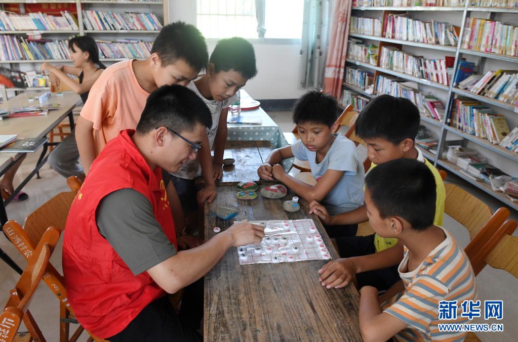 7月16日,在宾阳县中华镇山鸡村,一名青年志愿者和小朋友下棋。