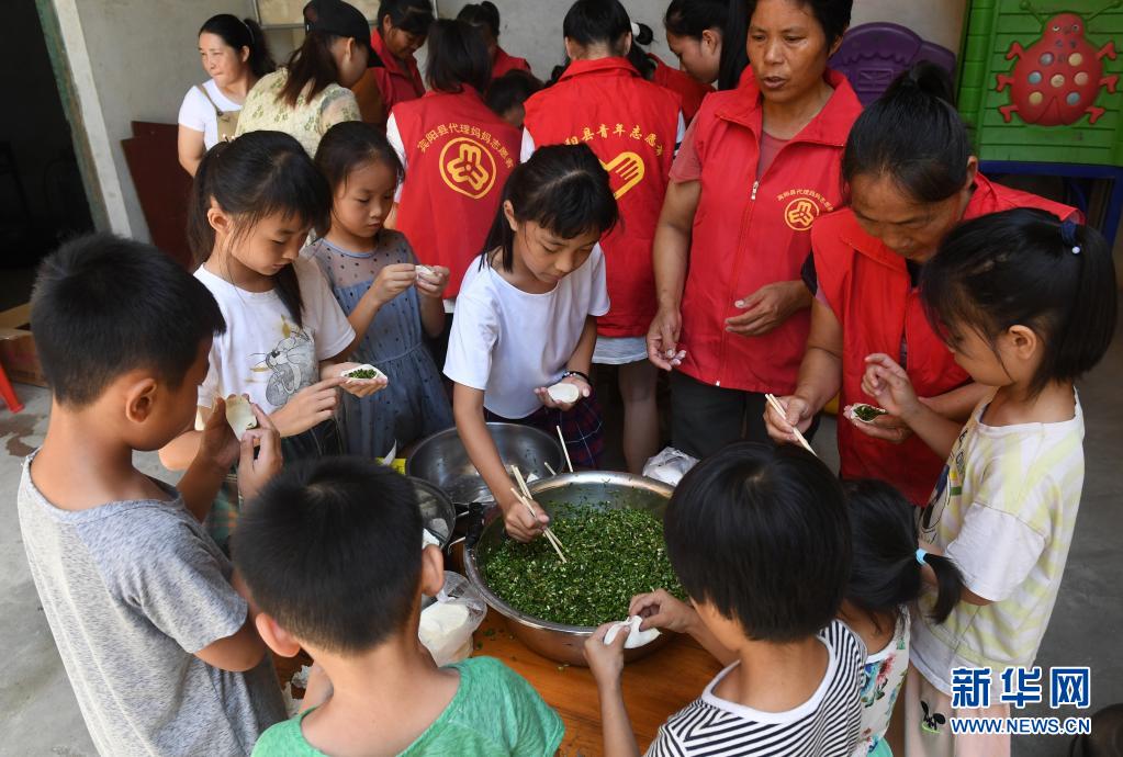 7月16日,在宾阳县中华镇山鸡村,小朋友在“代理妈妈志愿者”指导下学包饺子。