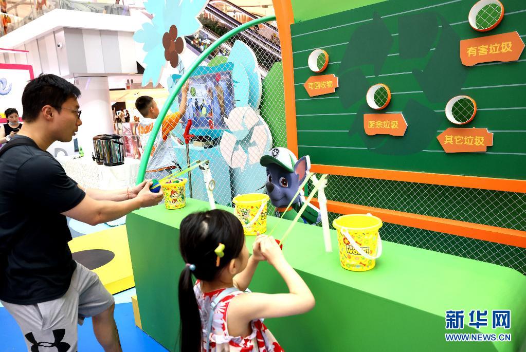 7月16日,小朋友在家人的陪伴下体验垃圾分类游戏。