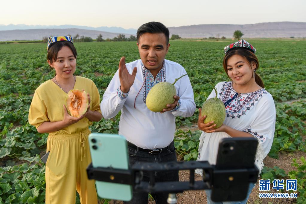 在新疆吐鲁番火焰山脚下的一处瓜田,网络主播通过直播推销家乡的哈密瓜(5月19日摄)。新华社记者 丁磊 摄