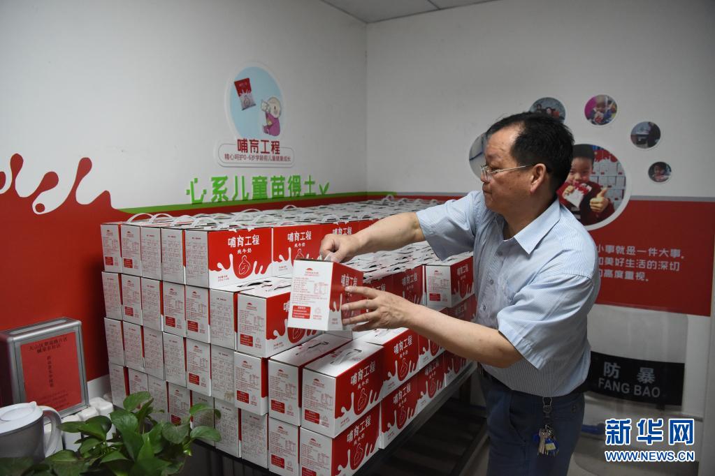 在乌鲁木齐市天山区翠泉路街道碱泉东社区,社区工作人员搬运“哺育工程”营养奶(2020年5月22日摄)。“哺育工程”在为义务教育阶段孩子免费提供学生奶的基础上,为全市0至6岁学龄前儿童每人每天提供1袋200毫升纯牛奶。新华社记者 丁磊 摄