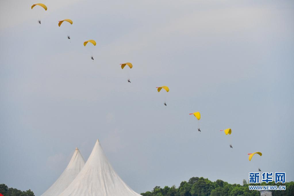 7月16日,在湖南株洲芦淞机场,动态飞行表演队队员进行动力伞表演。