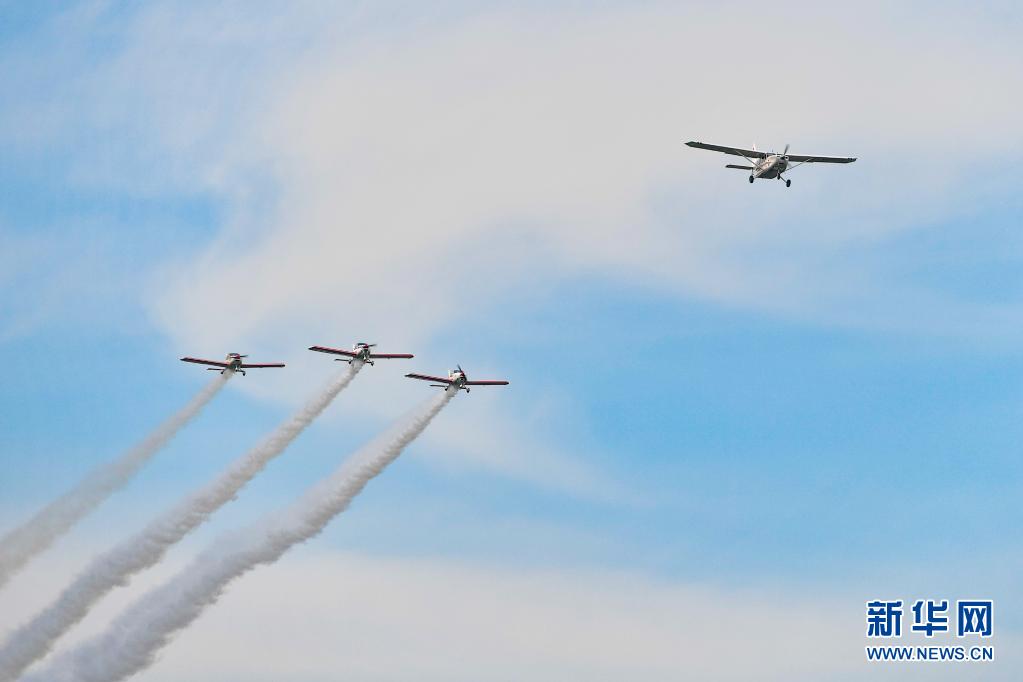 7月16日,在湖南株洲芦淞机场,动态飞行表演队队员进行固定翼编队飞行表演。