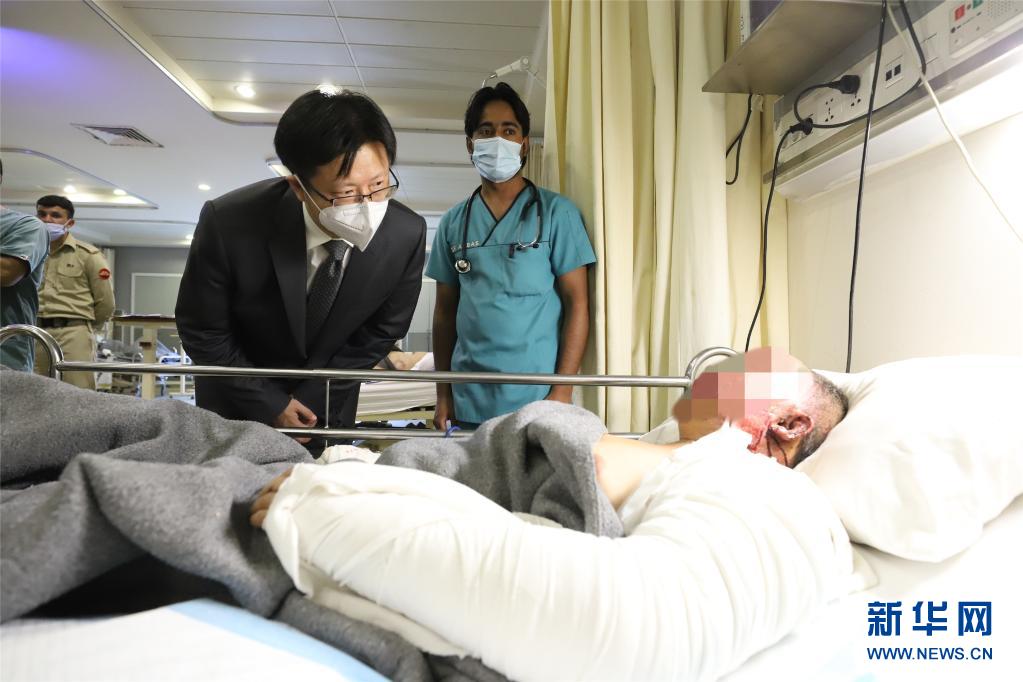 伊斯兰堡时间7月16日下午,中国赴巴基斯坦跨部门联合工作组组长、外交部涉外安全司副司长吴伟(右三),同中国驻巴基斯坦大使农融一同赶赴巴首都附近的陆军医院,看望和慰问在达苏恐怖袭击事件中受伤的中方人员,了解每名伤员的病情和救治情况。新华社记者 蒋超 摄