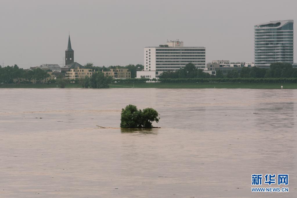 这是7月16日在德国西部城市杜塞尔多夫拍摄的水位上涨的莱茵河。