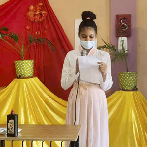 7月15日,在安提瓜和巴布达首都圣约翰,第十四届“汉语桥”世界中学生中文比赛安提瓜和巴布达赛区参赛选手唐琬(左)进行才艺展示。
