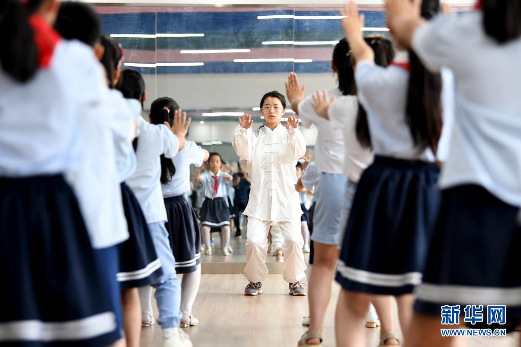 7月17日,大学生志愿者在花岗学区中心学校教孩子们练太极拳。