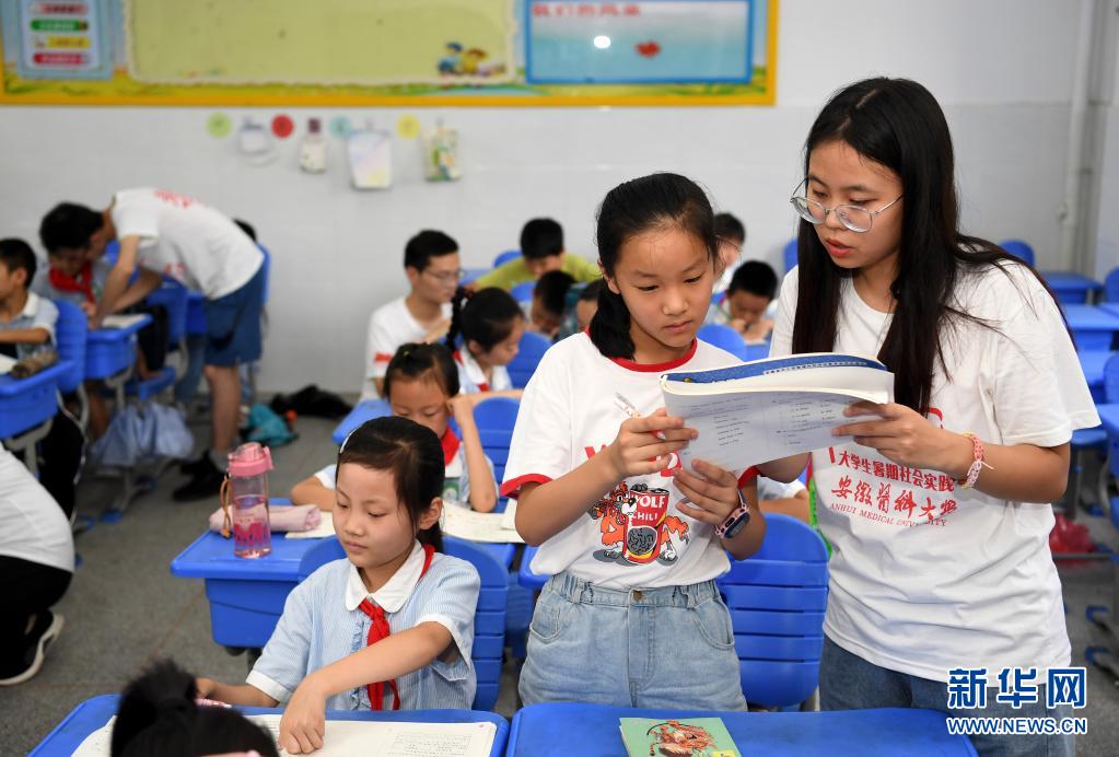 7月17日,大学生志愿者在花岗学区中心学校为孩子们辅导作业。