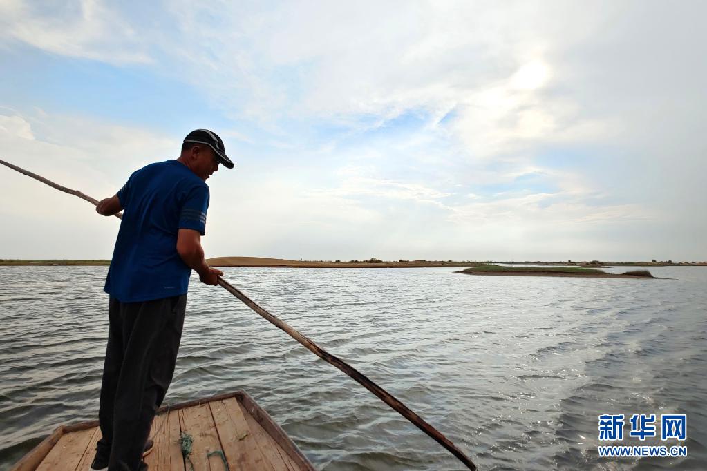 杭锦旗巴音温都尔嘎查牧民那仁满达呼在湿地撑船(7月16日手机拍摄)。那仁满达呼家有8800多亩牧场,过去近半被低矮的沙丘盘踞,黄河分凌引水后出现了1000多亩水面。眼看着水面越来越大,2017年他试投了一批蟹苗,如今一年毛收入近80万元。