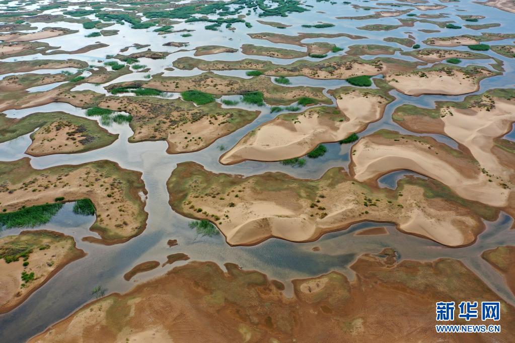 这是在杭锦旗巴音温都尔嘎查拍摄的库布其沙漠湿地(7月16日摄,无人机照片)。2014年以来,水利部门统筹防凌和荒漠治理,每年在黄河凌汛期向库布其北部的洼地分凌引水,至今已在沙漠中形成近60平方公里的湿地。