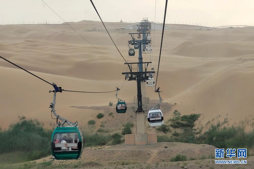 游客乘坐缆车在库布其响沙湾景区游览(7月15日手机拍摄)。