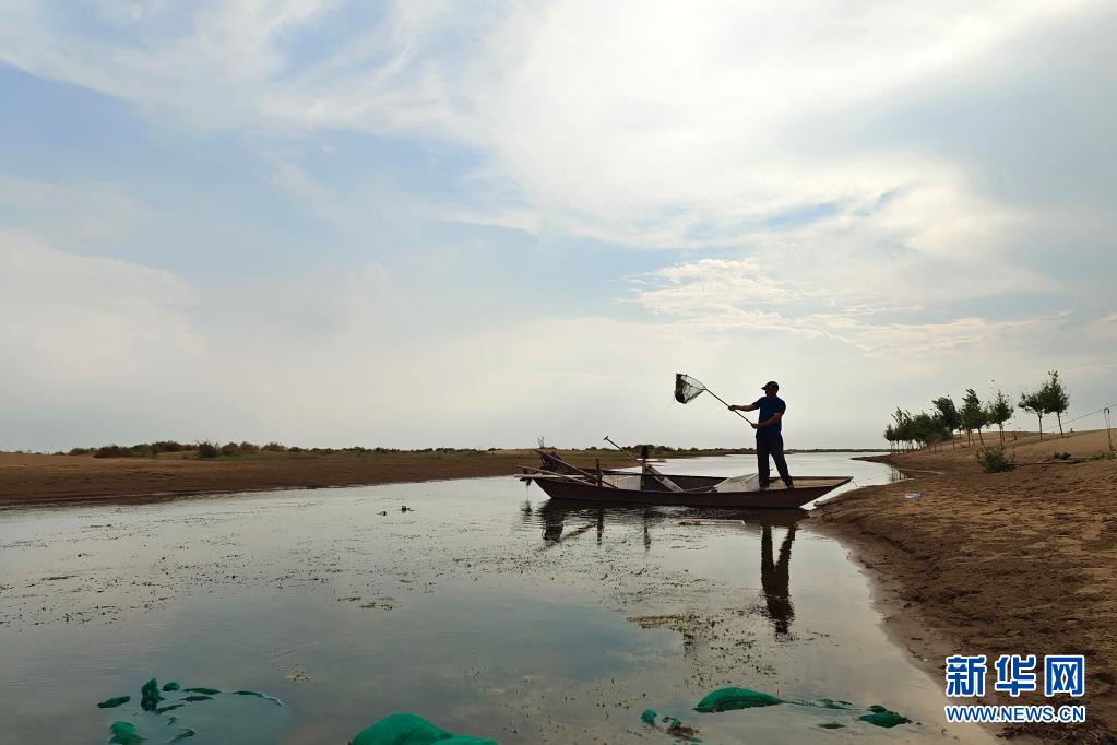 杭锦旗巴音温都尔嘎查牧民那仁满达呼在湿地捞水草(7月16日手机拍摄)。那仁满达呼家有8800多亩牧场,过去近半被低矮的沙丘盘踞,黄河分凌引水后出现了1000多亩水面。眼看着水面越来越大,2017年他试投了一批蟹苗,如今一年毛收入近80万元。