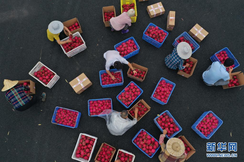 7月17日,在习水县同民镇同民村农业生态园,村民在分拣、包装火龙果(无人机照片)。