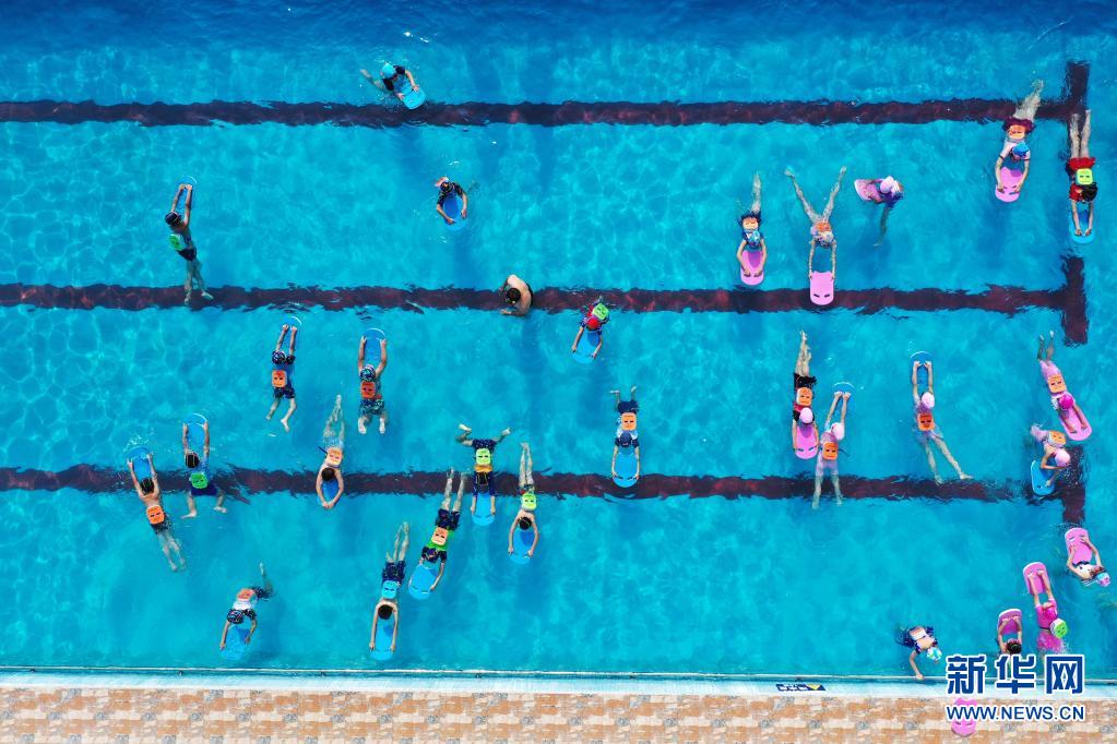 7月14日,四川省广安市武胜县万善小学的学生在学习游泳(无人机照片)。