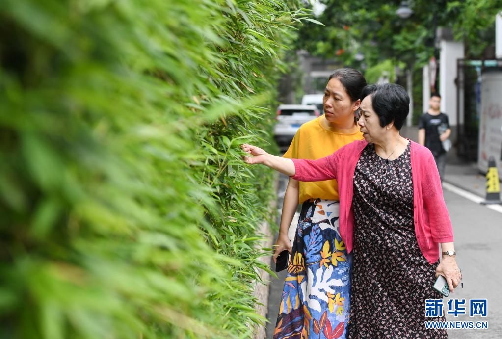 林丹(右)和军门社区党委副书记谢榕在社区检查景观绿植等工作(6月23日摄)。