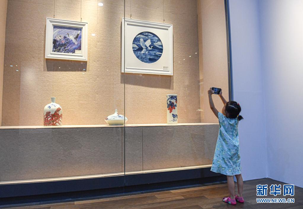 7月18日,一名小观众在位于海口的海南省博物馆拍摄景德镇陶瓷艺术作品展的展品。