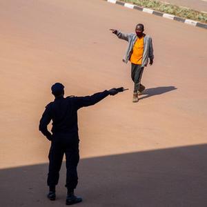 7月17日,在卢旺达首都基加利,警察在“禁足令”期间同街上的一名行人交谈。