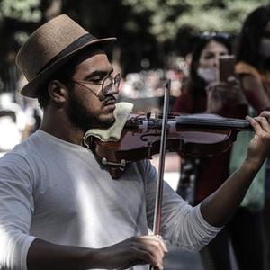 7月18日,一名男子在巴西圣保罗市的保利斯塔大街上拉小提琴。