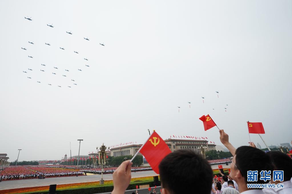 7月1日上午,庆祝中国共产党成立100周年大会将在北京天安门广场隆重举行。这是飞行庆祝表演。新华社记者 鞠焕宗 摄