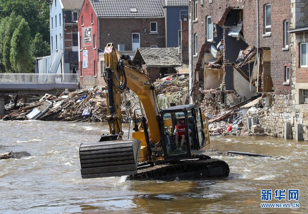 7月20日,一名工作人员在比利时受灾严重的佩平斯特操作挖掘机清理河道。