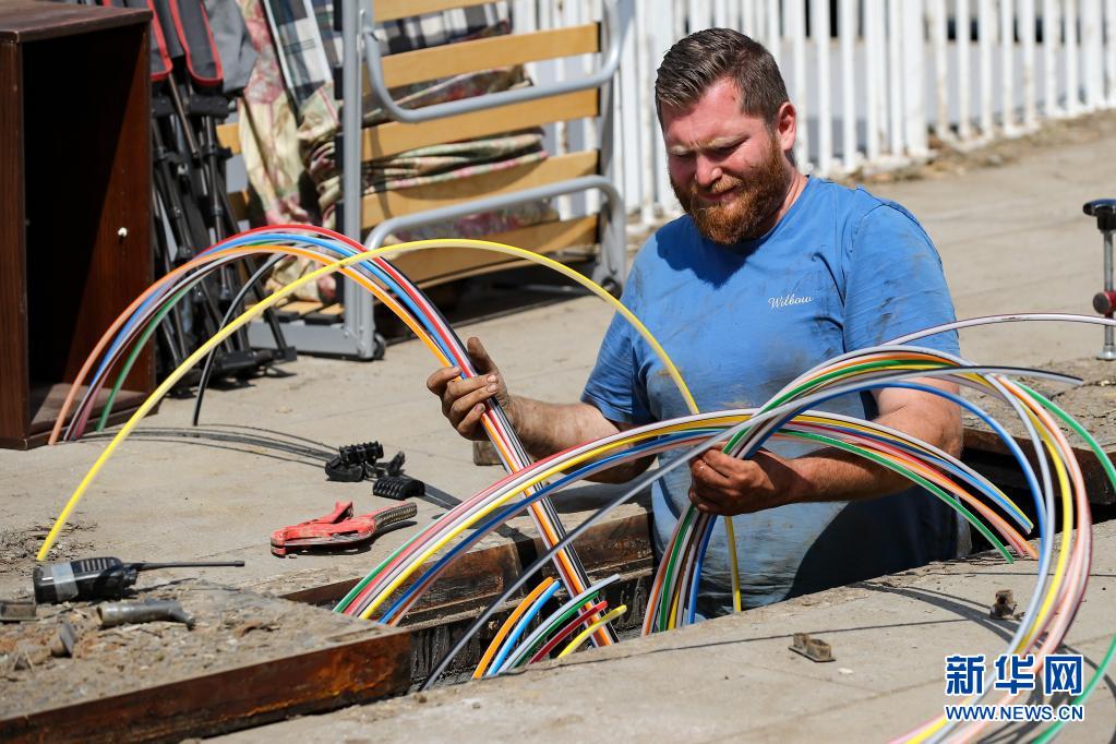 7月20日,一名工作人员在比利时受灾严重的佩平斯特进行接线作业。