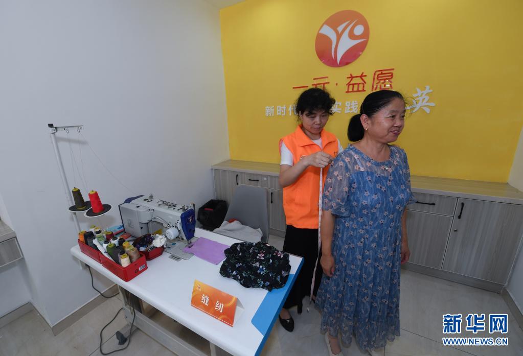 7月21日,在湖州市吴兴区飞英街道吉山四社区的固定服务点,“一元·益愿”志愿者为社区居民提供缝纫服务。