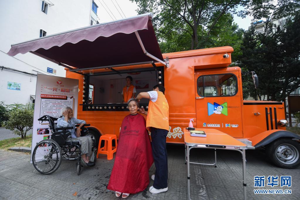 7月21日,在湖州市吴兴区飞英街道吉山四社区内,“一元·益愿”志愿者为社区居民理发。新华社记者 徐昱 摄