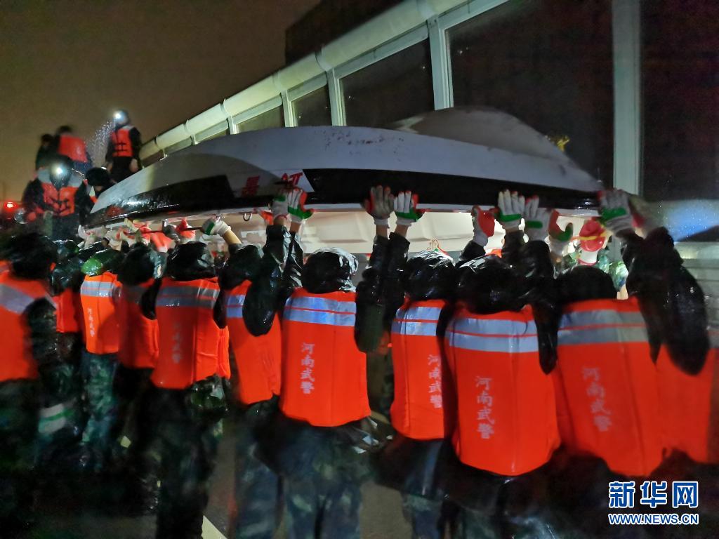7月21日,武警河南总队机动支队官兵在河南郑州陇海路附近搬运救援使用的冲锋舟(手机拍摄)。