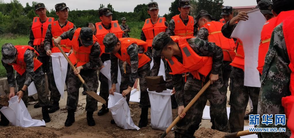 7月21日,战略支援部队信息工程大学毕业班学员在常庄水库大堤装填沙袋(手机拍摄)。