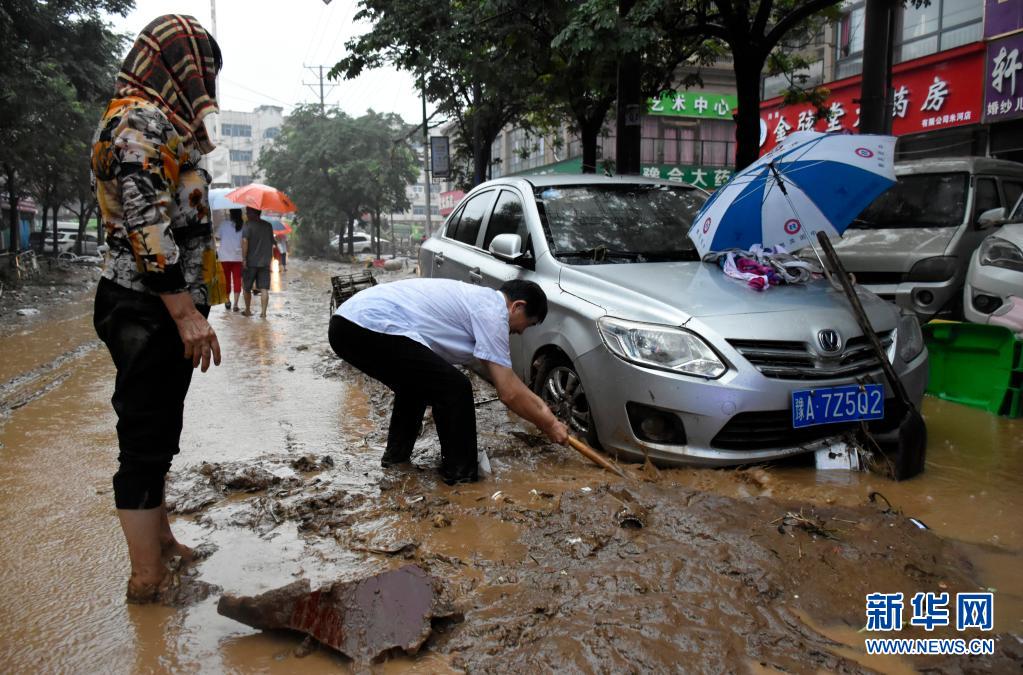 7月21日,巩义市米河镇群众在清理受陷汽车周边的淤泥。